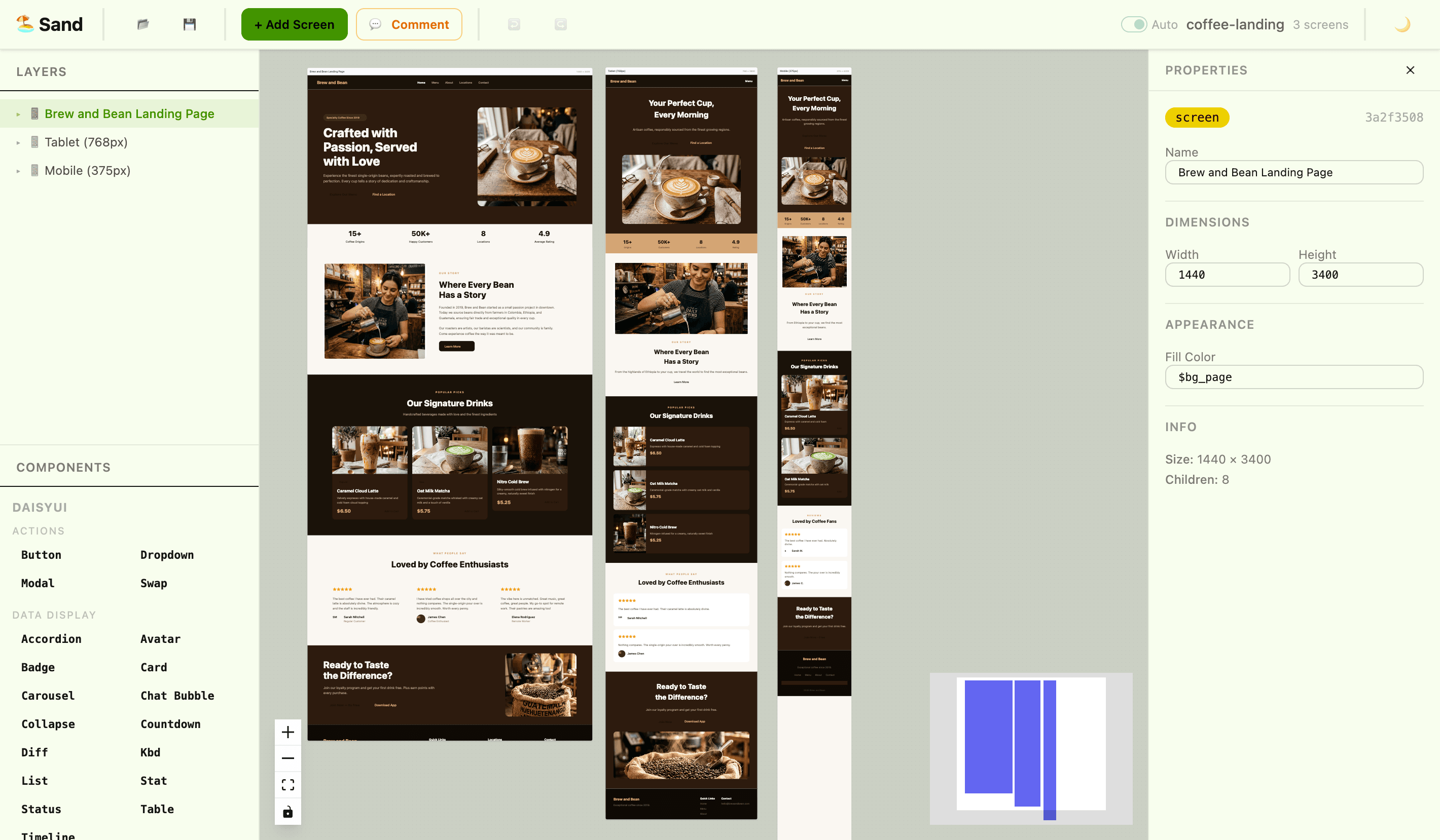 Most design tools (Figma, Sketch) use vector primitives. You draw a "button" but it's just a rectangle with rounded corners. Sand flips this: components are the primitive. Drop a daisyUI Button onto the canvas and you're looking at the real React component, rendered in a browser, with all its theme tokens applied.